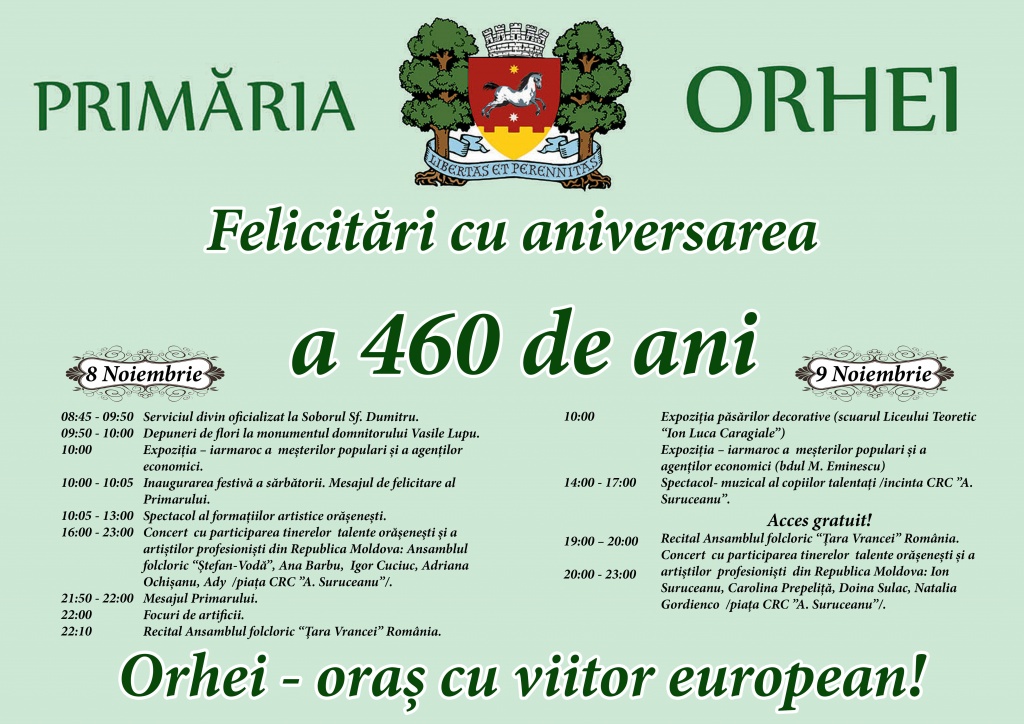 Vă aşteptăm cu drag să sărbătorim cei 460 de ani ai Orheiului- oraş cu viitor european!