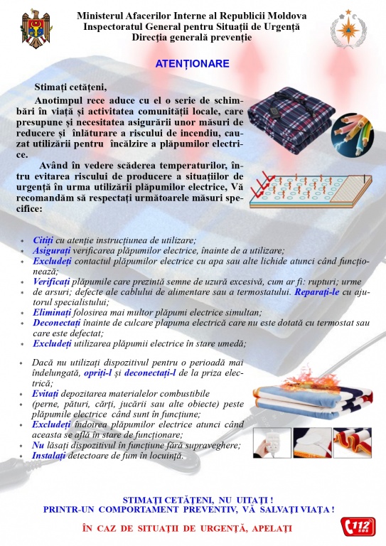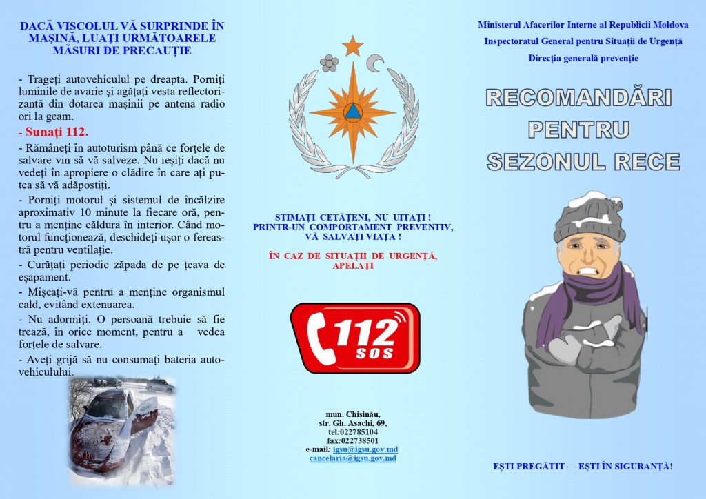 Inspectoratul General pentru Situații de Urgență (IGSU) informează cetățenii despre măsurile de prevenire și recomandările necesare pentru a evita situațiile de risc în perioada rece a anului.