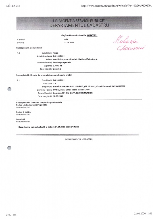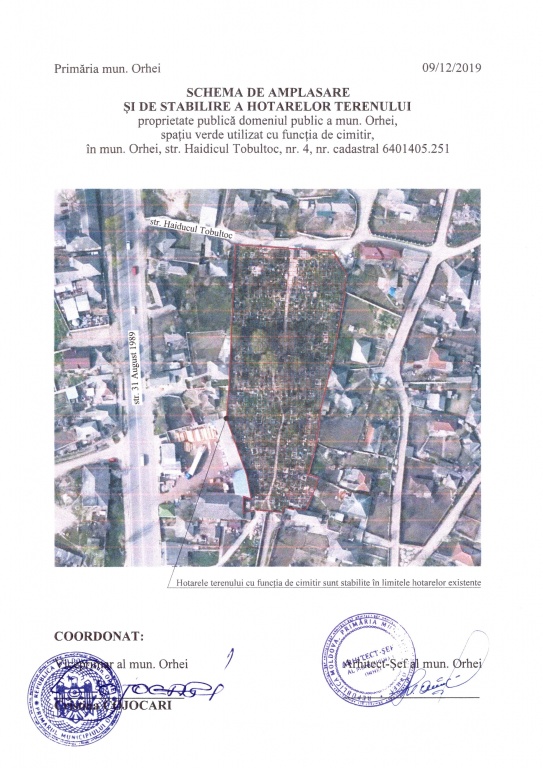 Proiectul de decizie a fost elaborat în baza Schemei de amplasare și de stabilire a hotarelor terenului utilizat sub cimitir, număr cadastral 6401405.251, str. Haiducul Tobultoc, nr. 4, mun. Orhei, elaborată de primăria mun. Orhei la 09.12.2019, avizată de viceprimarul și arhitectul şef al localităţii, a Actului de inventariere din 01.01.2020 a terenului semnat de Comisia de inventariere instituită prin Dispoziţia Primarului mun. Orhei nr. 306 din 29.11.2019 ,,Cu privire la instituirea comisiei de inventariere’’ şi a materialelor lucrărilor cadastrale de delimitare în mod selectiv a terenului proprietate publică domeniul public al UAT Orhei, număr cadastral 6401405.251, suprafaţa de 0,7777 ha, str. Haiducul Tobultoc, nr. 4, categoria de destinaţie II-terenuri din intravilanul localităţilor, modul de folosinţă-amenajat, elaborate de Î.S. ,,IPOT’’.